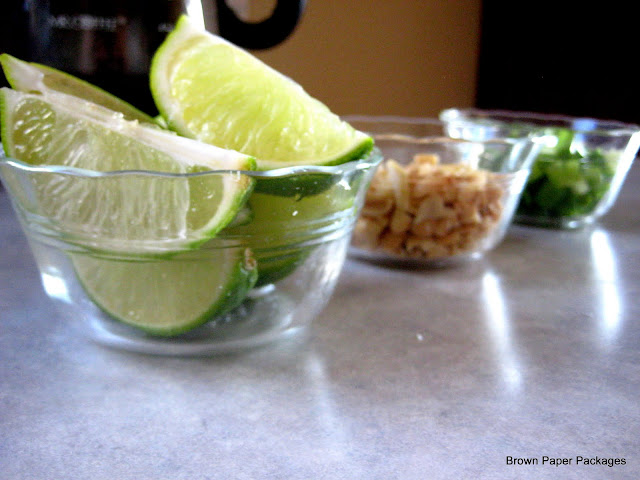 First, cut up one or two limes into wedges, then chop up three or four green onions and some salted peanuts. The amount you cut up really depends on how much you like to eat...there's no rule here.
